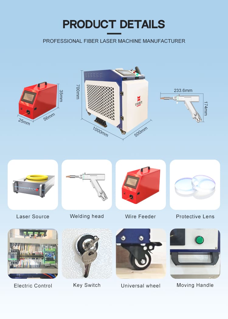 2000 W 3000 W laiką taupantis rankinis lazerinio suvirinimo aparatas užtikrina greitą ir efektyvų nerūdijančio plieno, anglinio plieno, aliuminio ir įvairių metalo lakštų suvirinimą.