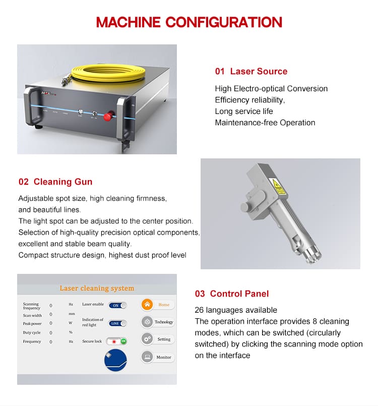 Ako bezkontaktný laserový čistiaci stroj nepoškodzuje substrát dielov, nešetrí spotrebný materiál a nešetrí energiu a ochranu životného prostredia a dokáže účinne odstraňovať živicu, olej, škvrny, špinu/hrdzu, nátery, obklady a farby z povrchu obrobku, aby splnil požiadavky na čistenie na komplexné modelovanie a jemné polohovanie v oblasti priemyselného spracovania, dosiahol vyšší stupeň čistoty čistiaceho efektu a výhody výroby pri nižších komplexných nákladoch.