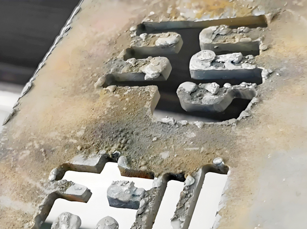 Nedostatočný výstupný výkon zabraňuje úplnému roztaveniu materiálu, čo vedie k tvorbe vkladu.